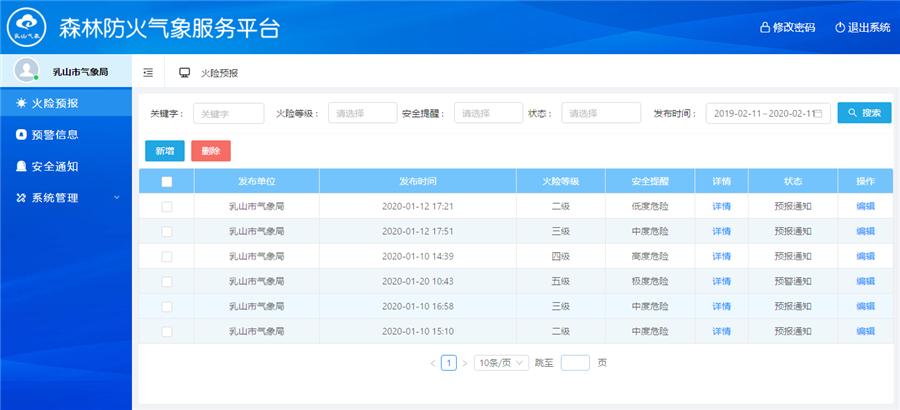 系统共分为:火险预报、预警信息、安全通知、系统管理四大模块。